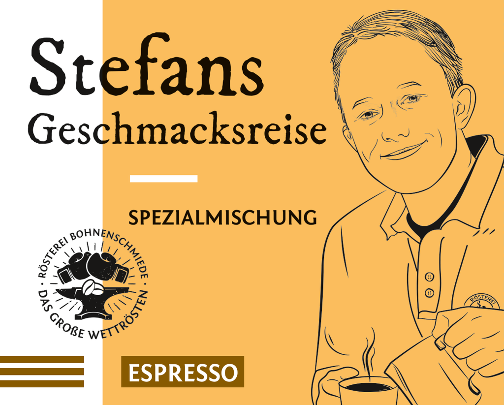 Und das sagt Stefan dazu: "Meine Mischung ist ein aromatisches Souvenir aus der Welt des Kaffees. Sie trägt den Namen Stefans Geschmackreise und entfaltet in der Tasse einen schönen Schoko-Kakao-Anteil gepaart mit blumigen Noten. Ich trinke sie am liebsten als Espresso nach einem selbstgezauberten Grillmenü."